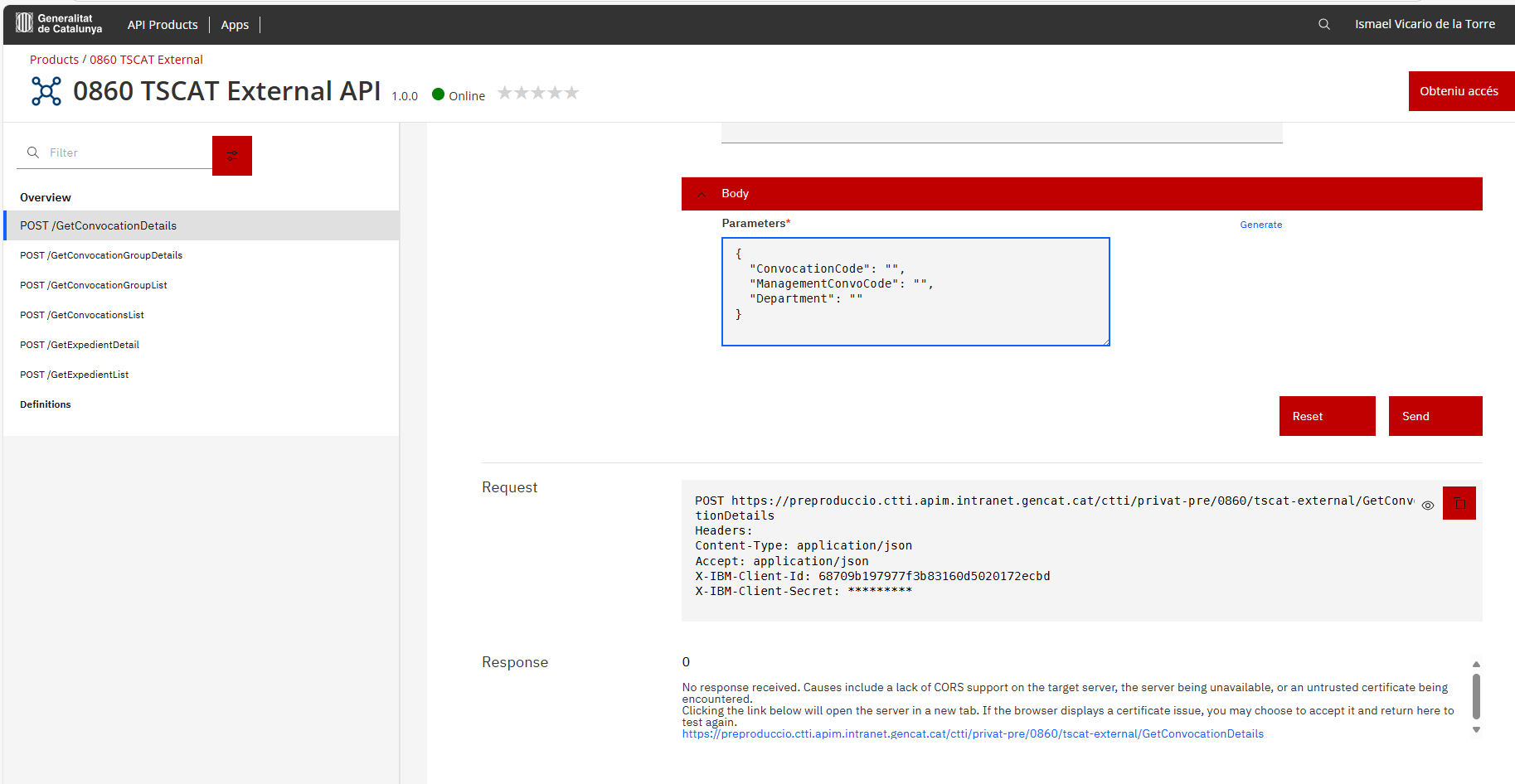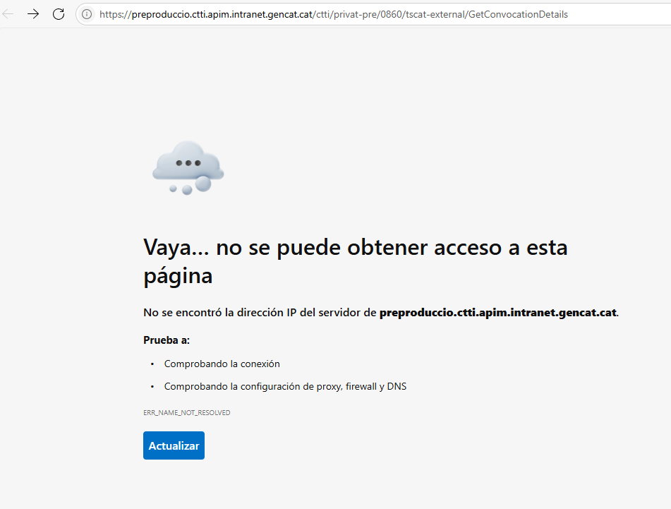 No sé si es que n’hi ha algun error, tenim que anotar alguna cosa en el hosts, però igualment, encara que fem això, des de la pàgina per fer proves de les apis de CTTI, si funciones correctament, tindria que donar algun tipus de error: de credencials, de format o de que falten dades en el filtre no de que no obté resposta.
